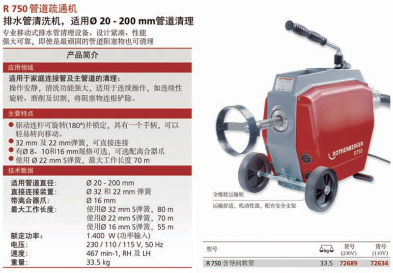 ●(排水管清洗機,適用于直徑φ20-200mm管道清理,專業(yè)移動式排水管清理設備。設計緊湊、設計緊湊、性能強大可靠 即使是最頑固的管道阻塞物也可清理。)